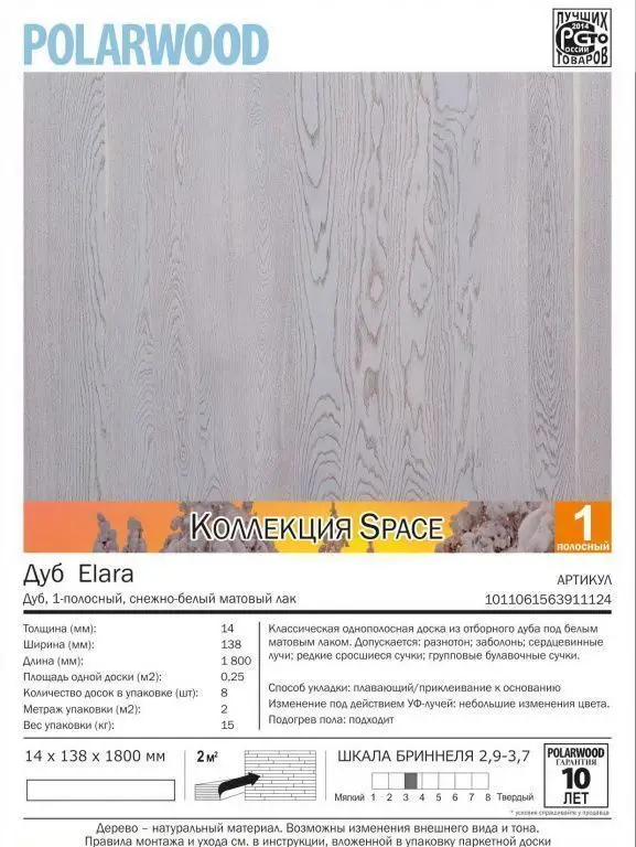 Паркетная доска POLARWOOD Classic Однополосная Дуб Элара Премиум снежно-белый матовый лак (14*138*1800/8шт/2,0 м2/упак)