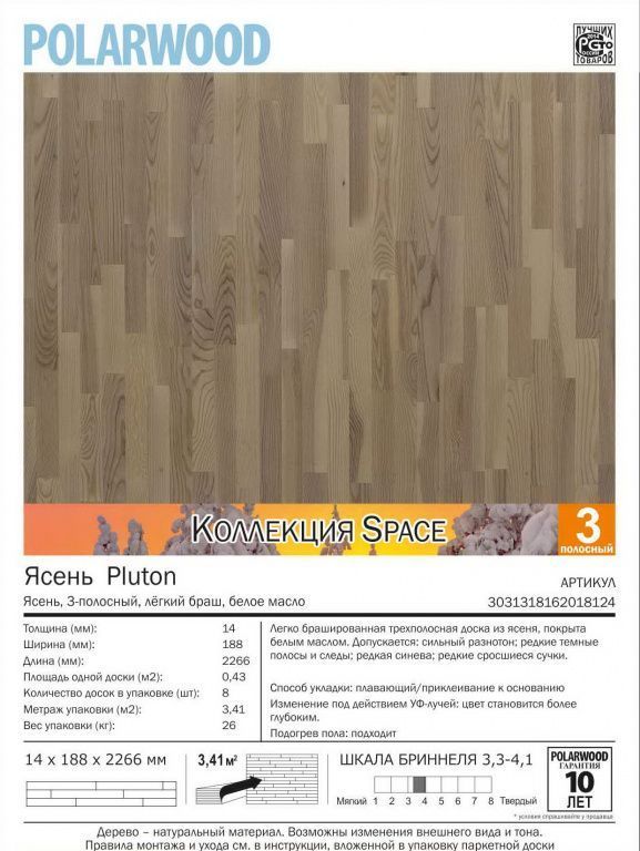 Паркетная доска POLARWOOD Space Ясень Плутон белое масло (14*188*2266/8шт/3,41 м2/упак)